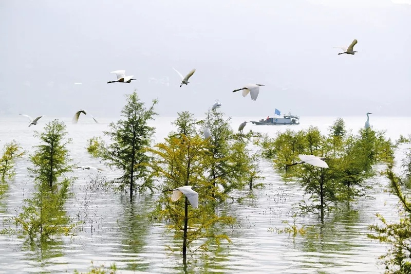 人民法院認真貫徹落實習近平生態(tài)文明思想,努力為生態(tài)文明建設與綠色發(fā)展提供優(yōu)質司法服務。在長江三峽庫區(qū),為解決庫區(qū)消落帶植物存活的治理難題,重慶法院引進了耐淹耐旱的中山杉。圖為重慶法院長江三峽庫區(qū)生態(tài)修復司法保護示范林的中山杉在水庫蓄水時被部分淹沒的景象。最高人民法院供圖