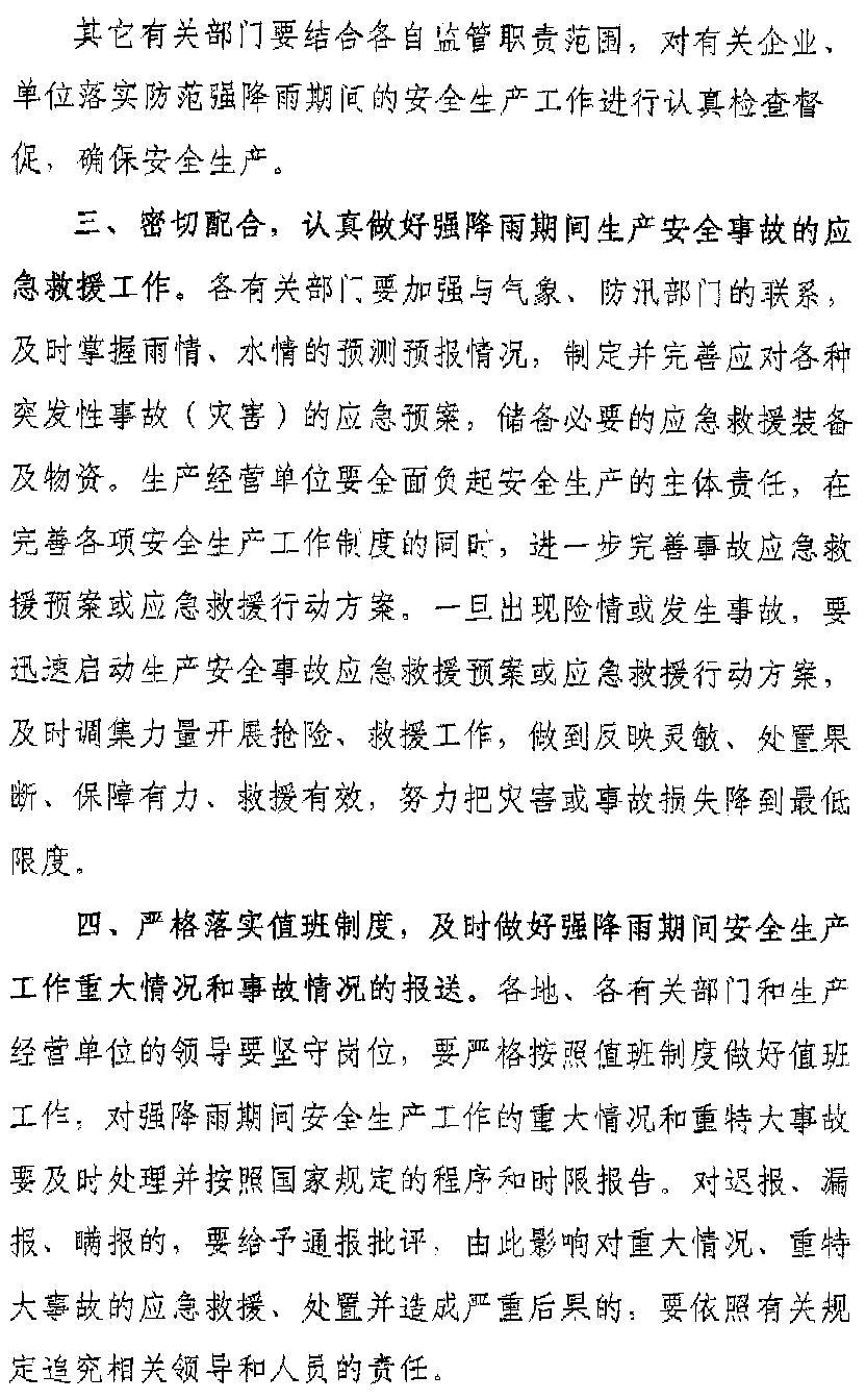 現(xiàn)將《福建省人民政府安全生產(chǎn)委員會關(guān)于切實做好防范強降雨期間全省安全生產(chǎn)工作的緊急通知》(閩安委辦明電[2010]14號)轉(zhuǎn)發(fā)給你們。各企業(yè)要從思想上高度重視,認真貫徹落實《通知》要求,加強領(lǐng)導,強化責任制落實,做好值班安排,加強巡查,及時排查和整改隱患,切實采取有效防范措施,做好強降雨期間的安全生產(chǎn)工作。