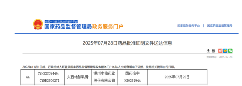 近日,水仙藥業(yè)新產(chǎn)品夫西地酸乳膏獲得國家藥品監(jiān)督管理局頒發(fā)藥品注冊批件,并視同通過一致性評價,預計于2025年10月投產(chǎn)并上市銷售。